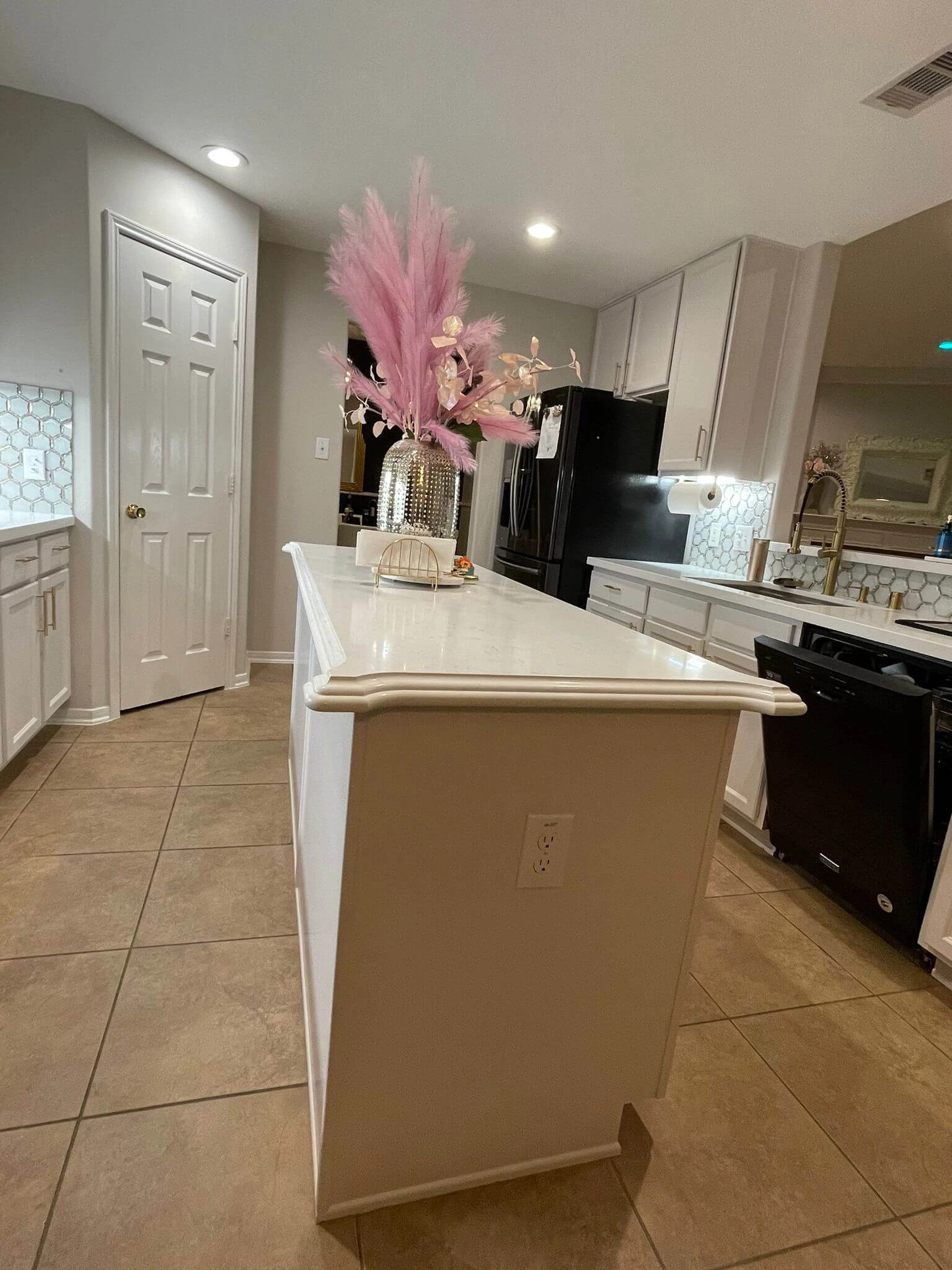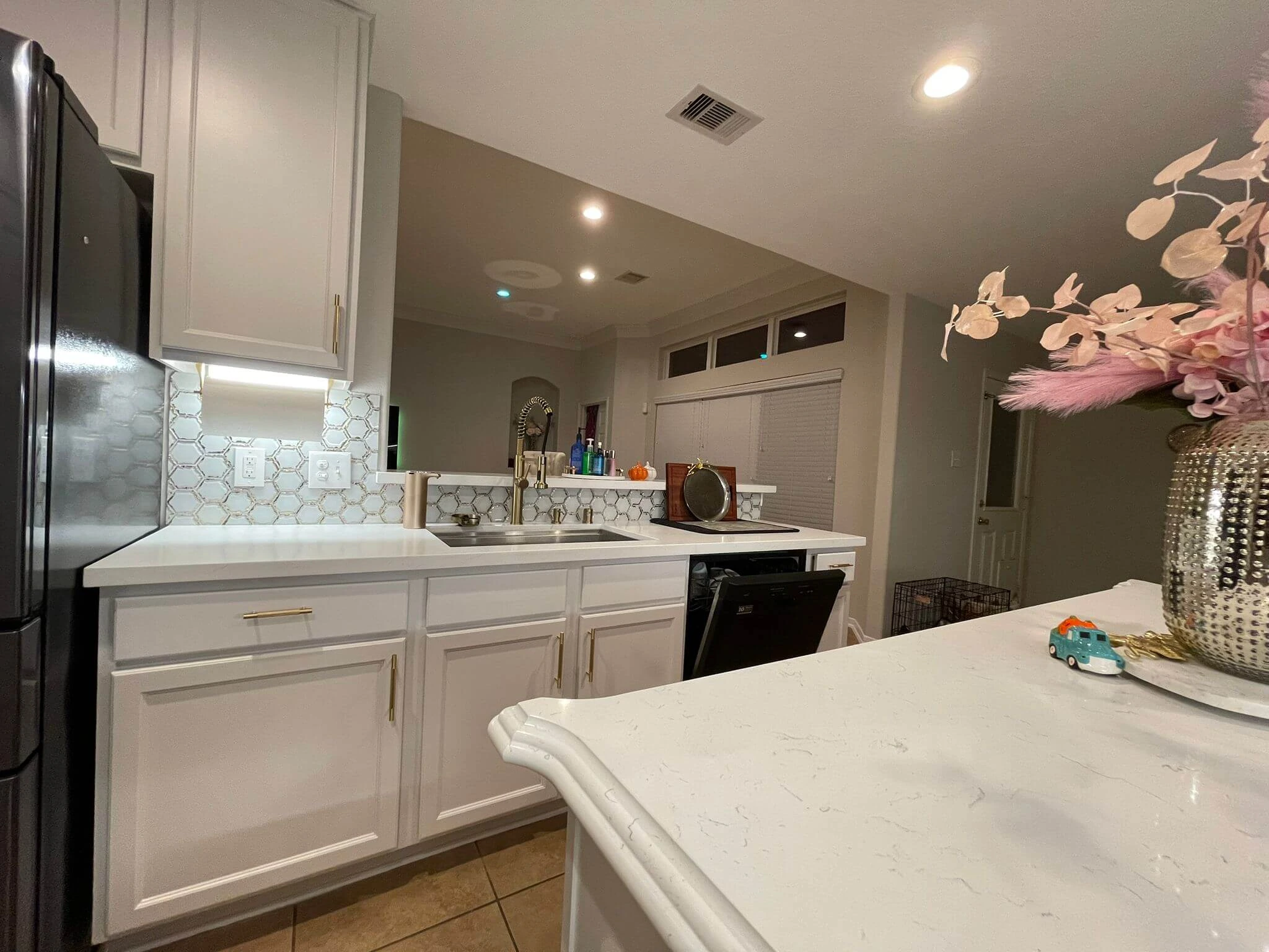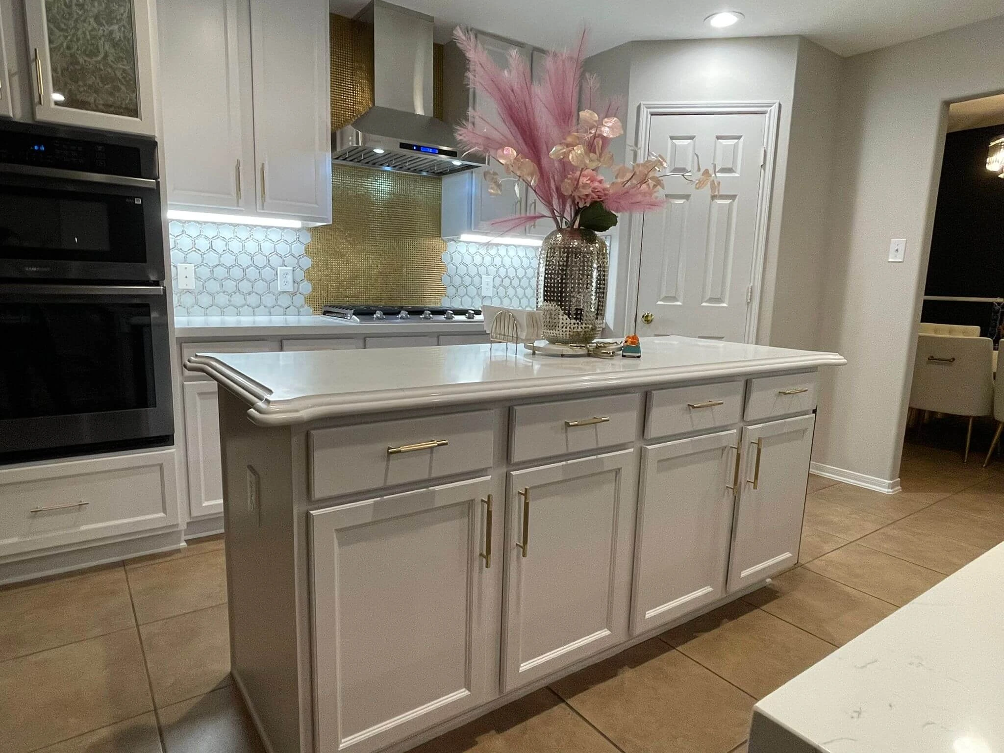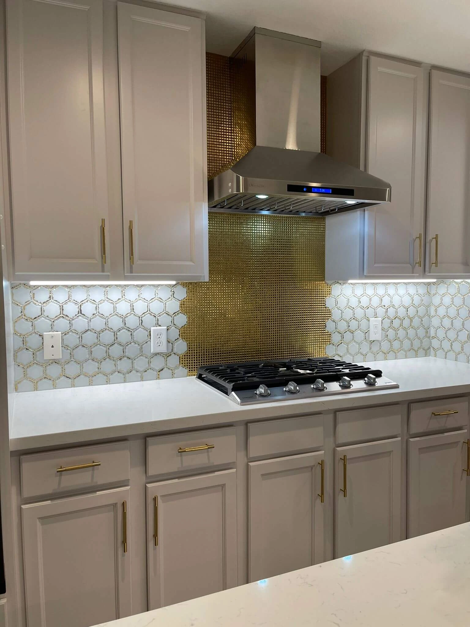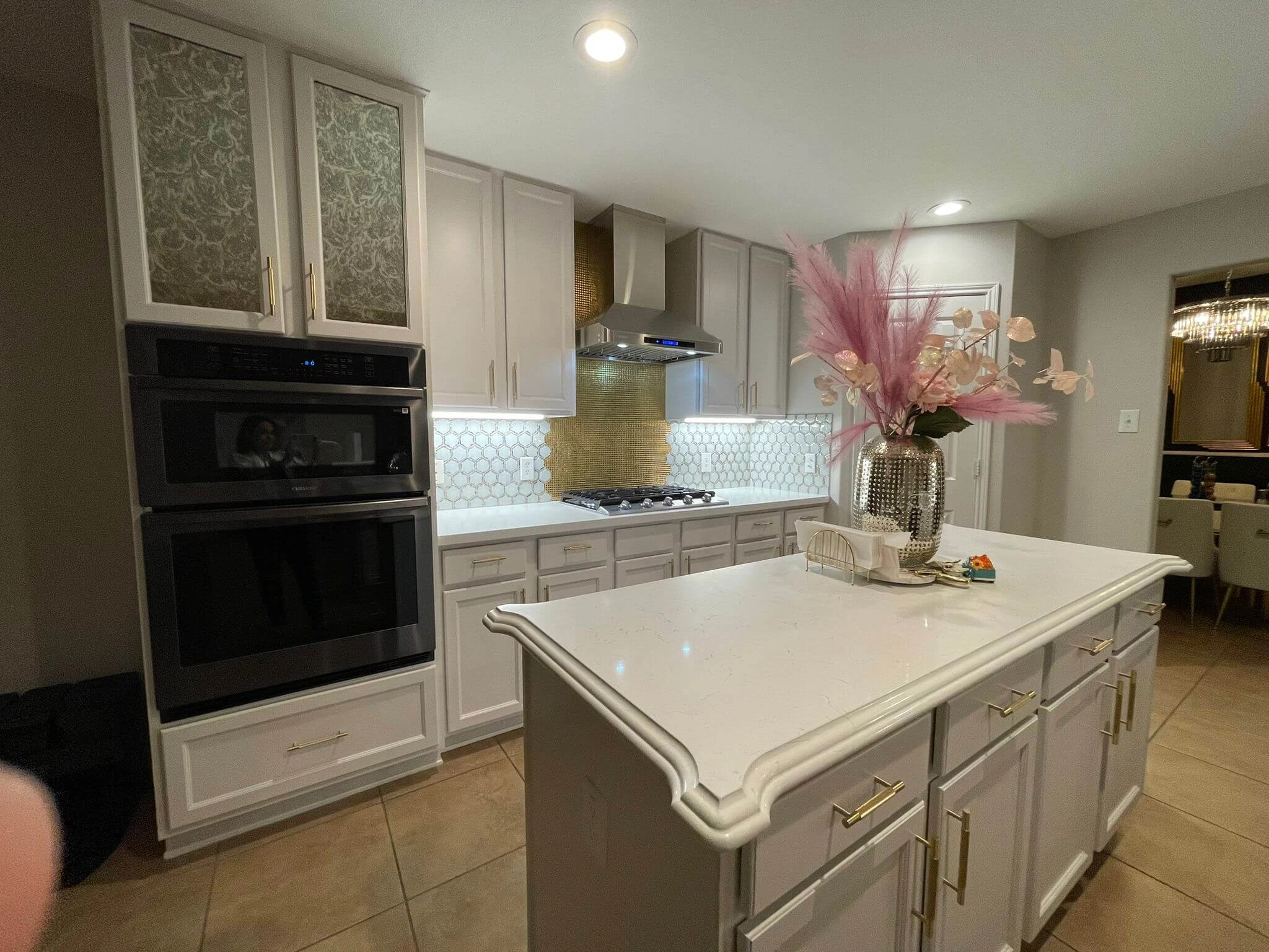 In our recent kitchen remodel, we transformed the space with a blend of practicality and style. The cabinets received a fresh look with a skillfully applied coat of paint, while pre-fabricated and custom countertops added both functionality and aesthetic appeal. The custom glasswork on cabinets introduced a touch of sophistication, complemented by an exotic backsplash that became a focal point of elegance. The addition of a kitchen hood not only enhanced ventilation but also contributed to a sleek and modern atmosphere. To add a hint of glamour, we painted the walls with a subtle glitter finish, elevating the overall aesthetic of the renovated kitchen.