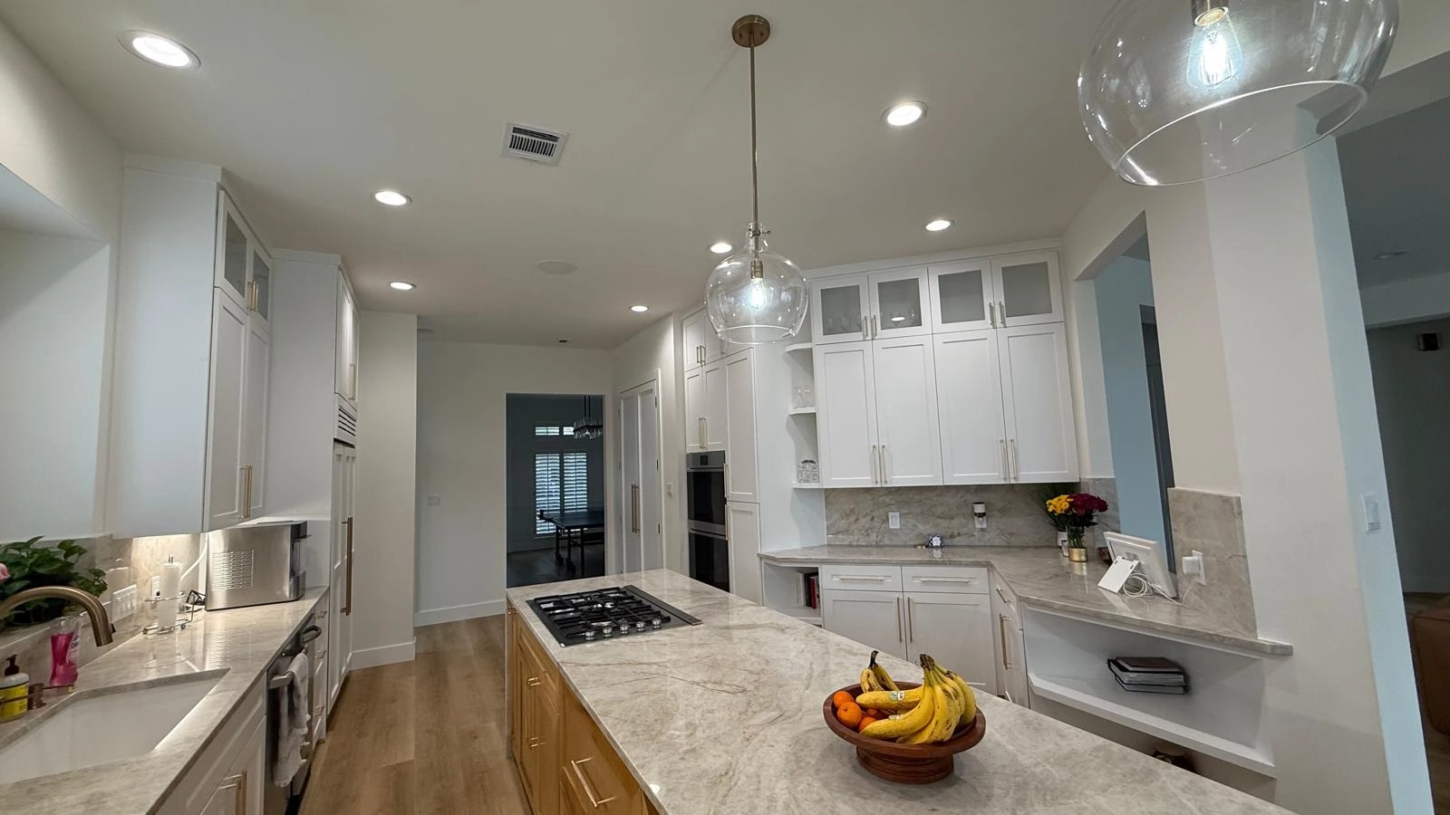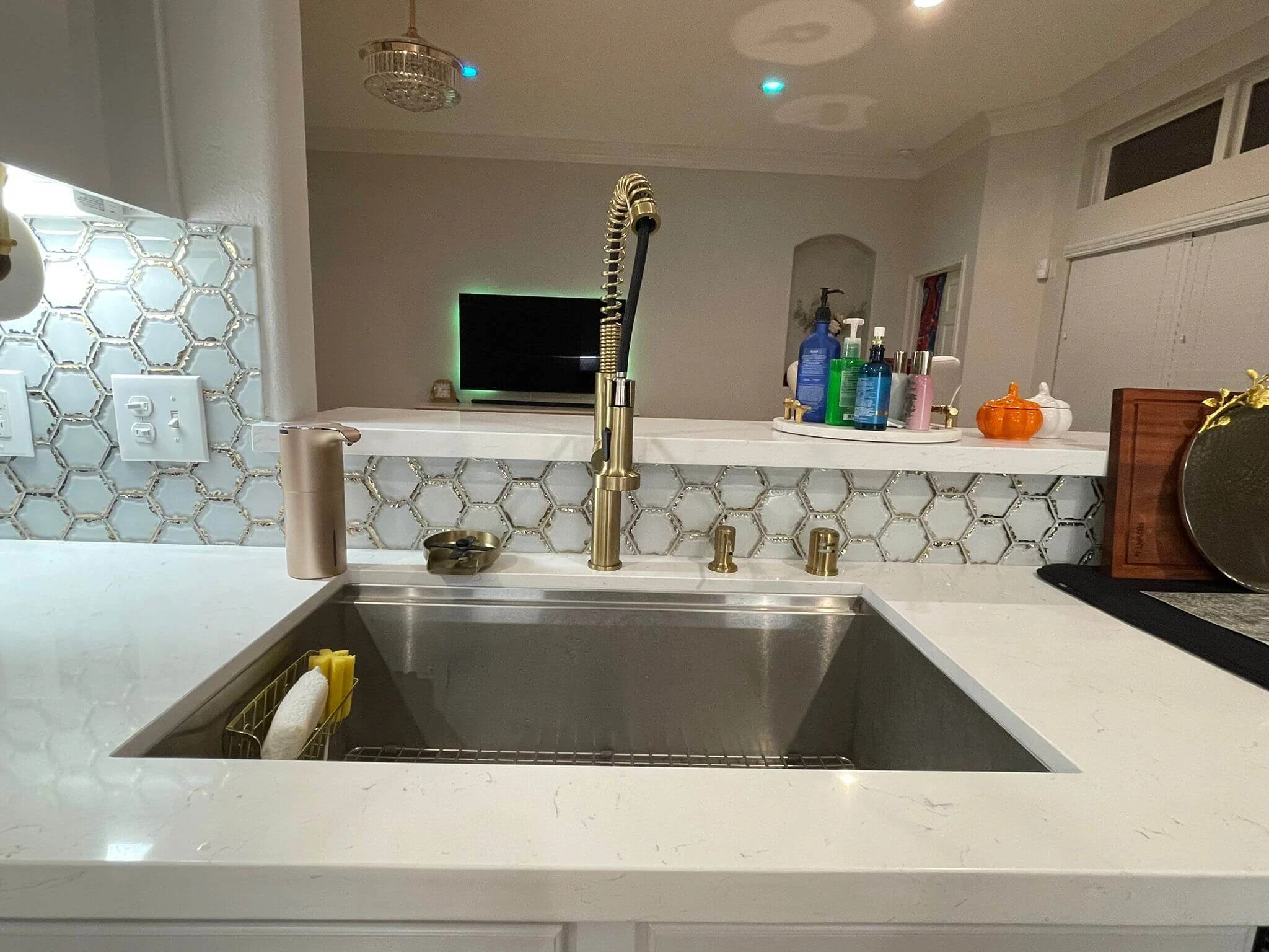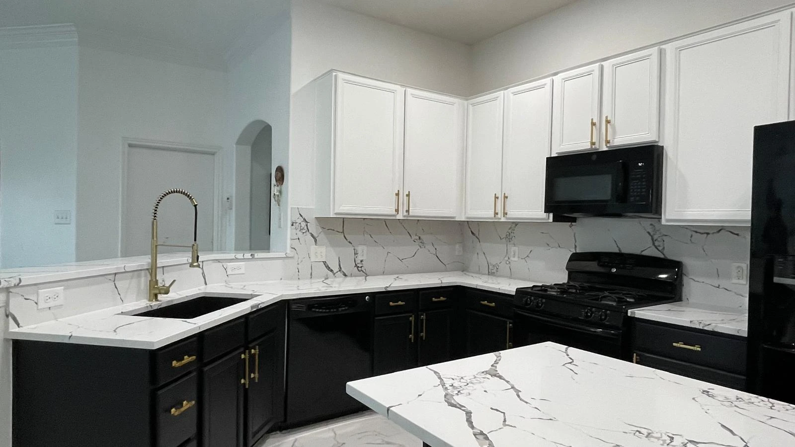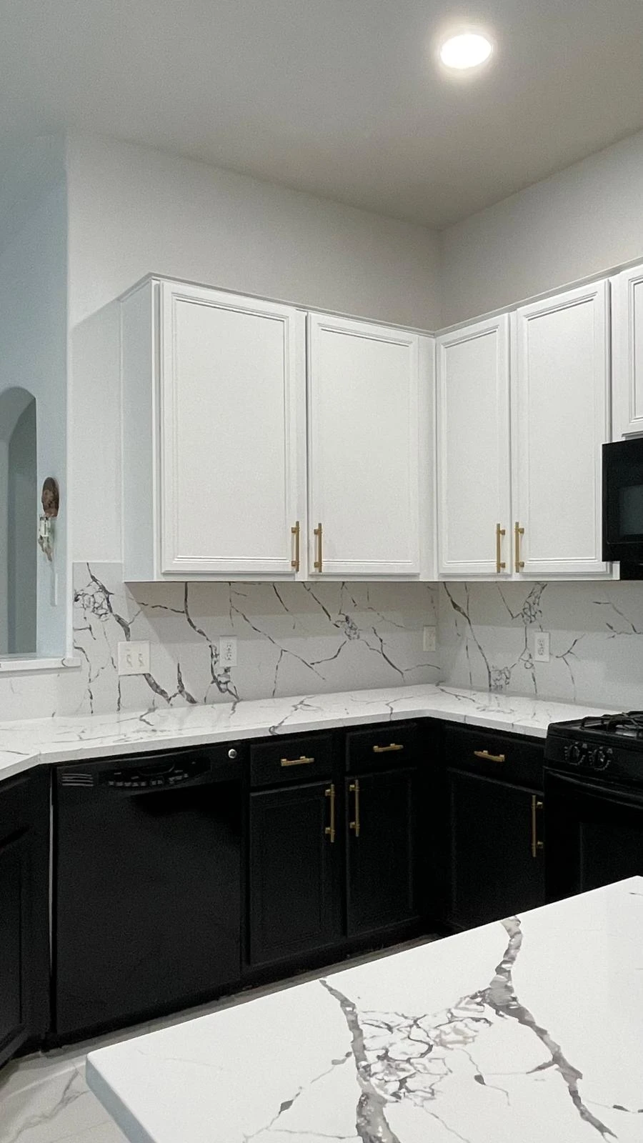 In our recent kitchen remodel, we transformed the space with a blend of practicality and style. The cabinets received a fresh look with a skillfully applied coat of paint, while pre-fabricated and custom countertops added both functionality and aesthetic appeal. The custom glasswork on cabinets introduced a touch of sophistication, complemented by an exotic backsplash that became a focal point of elegance. The addition of a kitchen hood not only enhanced ventilation but also contributed to a sleek and modern atmosphere. To add a hint of glamour, we painted the walls with a subtle glitter finish, elevating the overall aesthetic of the renovated kitchen.