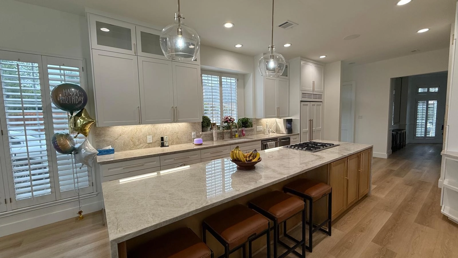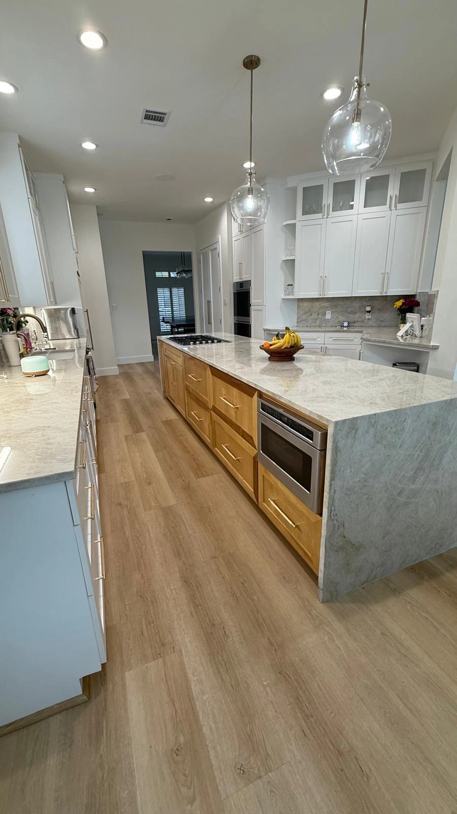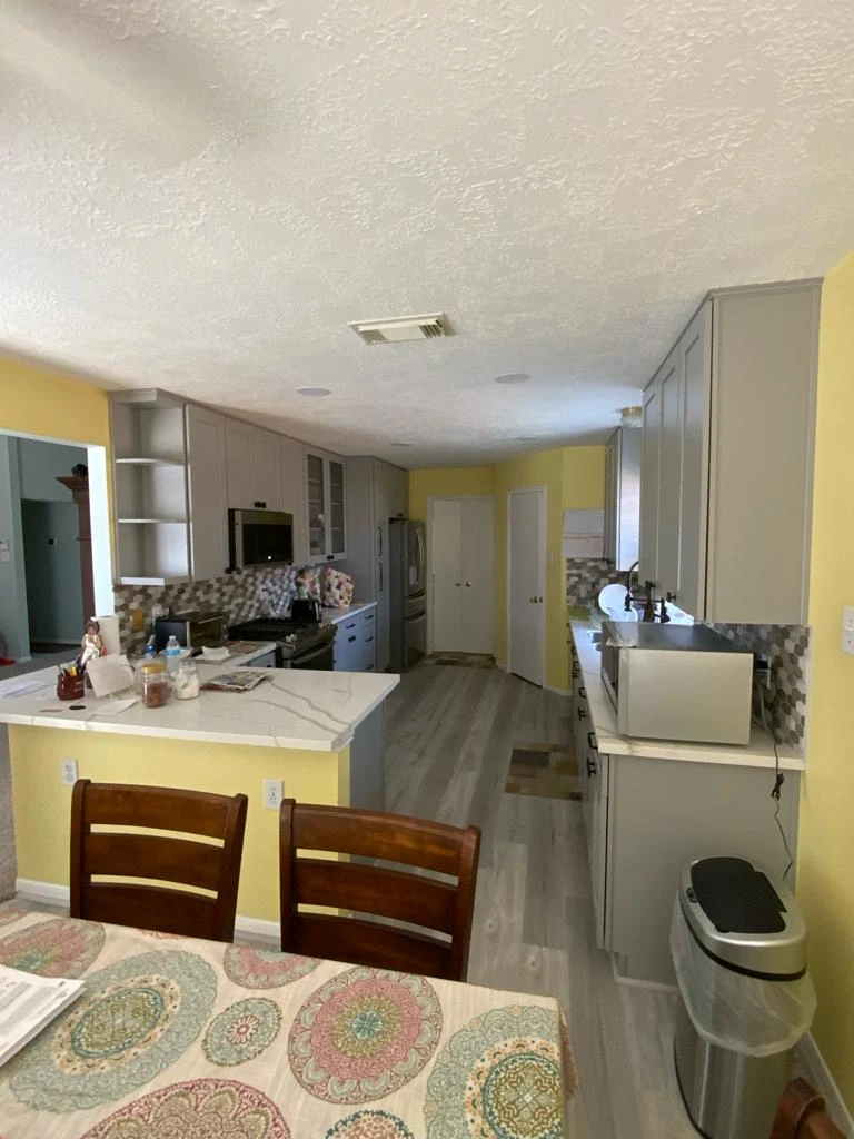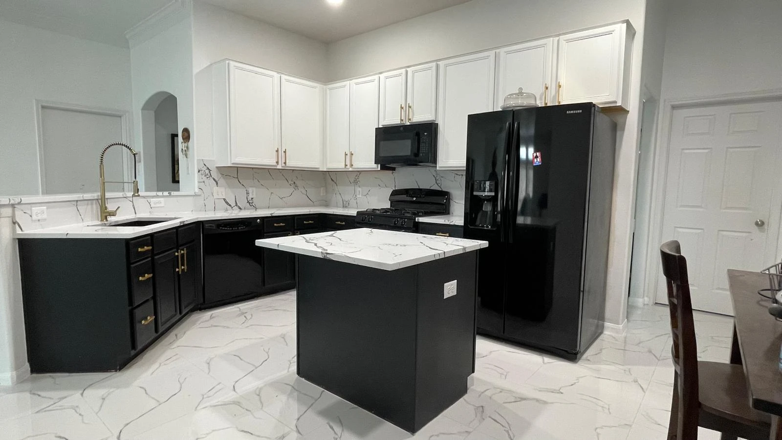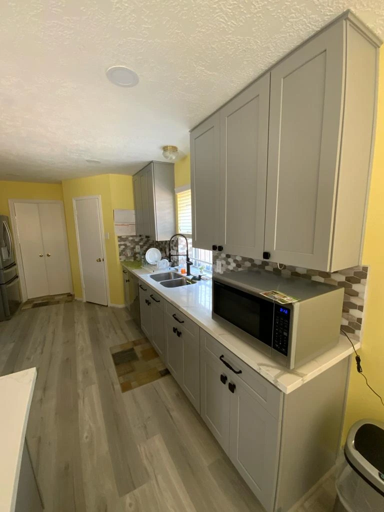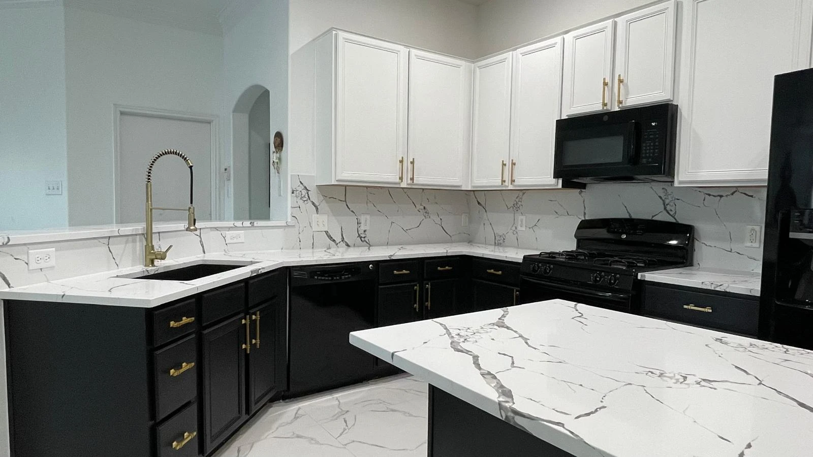 In our recent kitchen remodel, we transformed the space with a blend of practicality and style. The cabinets received a fresh look with a skillfully applied coat of paint, while pre-fabricated and custom countertops added both functionality and aesthetic appeal. The custom glasswork on cabinets introduced a touch of sophistication, complemented by an exotic backsplash that became a focal point of elegance. The addition of a kitchen hood not only enhanced ventilation but also contributed to a sleek and modern atmosphere. To add a hint of glamour, we painted the walls with a subtle glitter finish, elevating the overall aesthetic of the renovated kitchen.