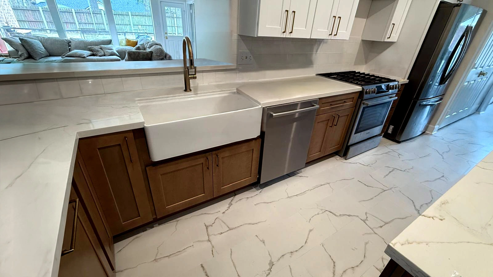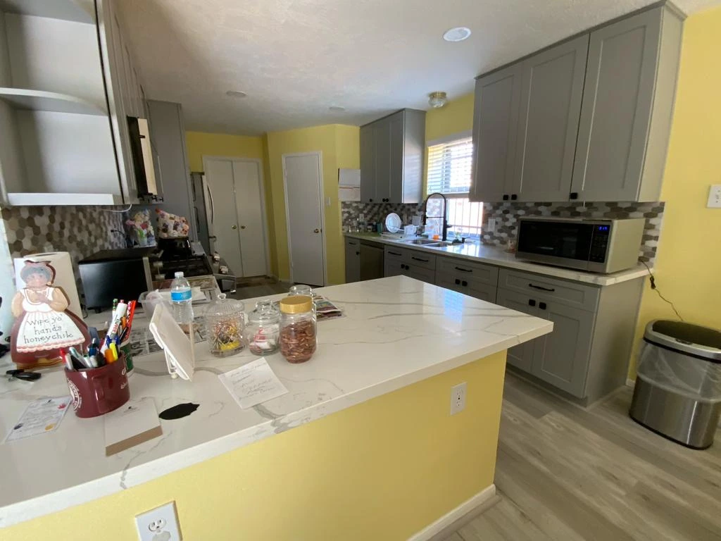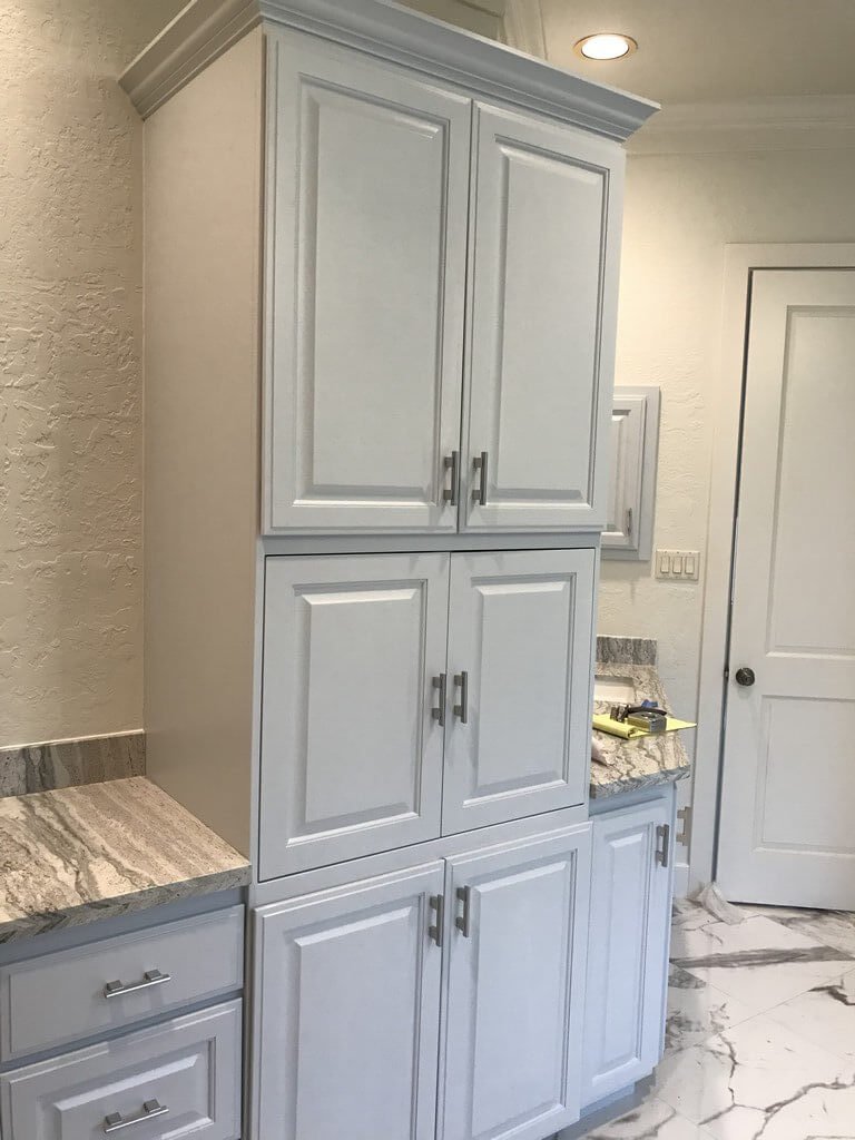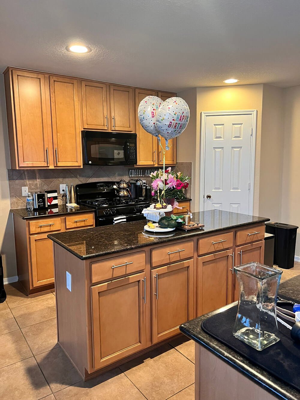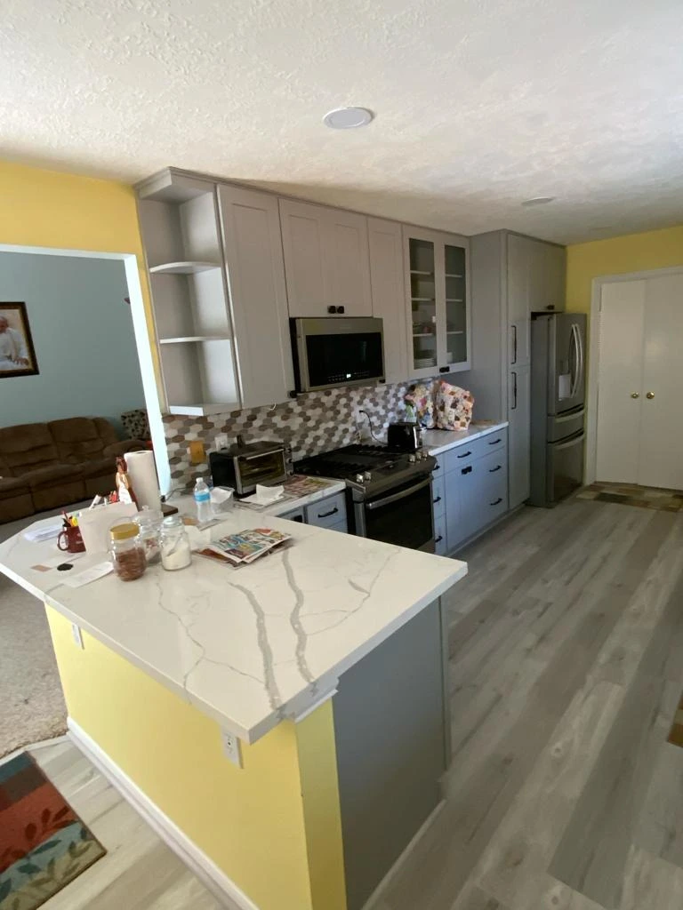In our recent kitchen remodel, we transformed the space with a blend of practicality and style. The cabinets received a fresh look with a skillfully applied coat of paint, while pre-fabricated and custom countertops added both functionality and aesthetic appeal. The custom glasswork on cabinets introduced a touch of sophistication, complemented by an exotic backsplash that became a focal point of elegance. The addition of a kitchen hood not only enhanced ventilation but also contributed to a sleek and modern atmosphere. To add a hint of glamour, we painted the walls with a subtle glitter finish, elevating the overall aesthetic of the renovated kitchen.