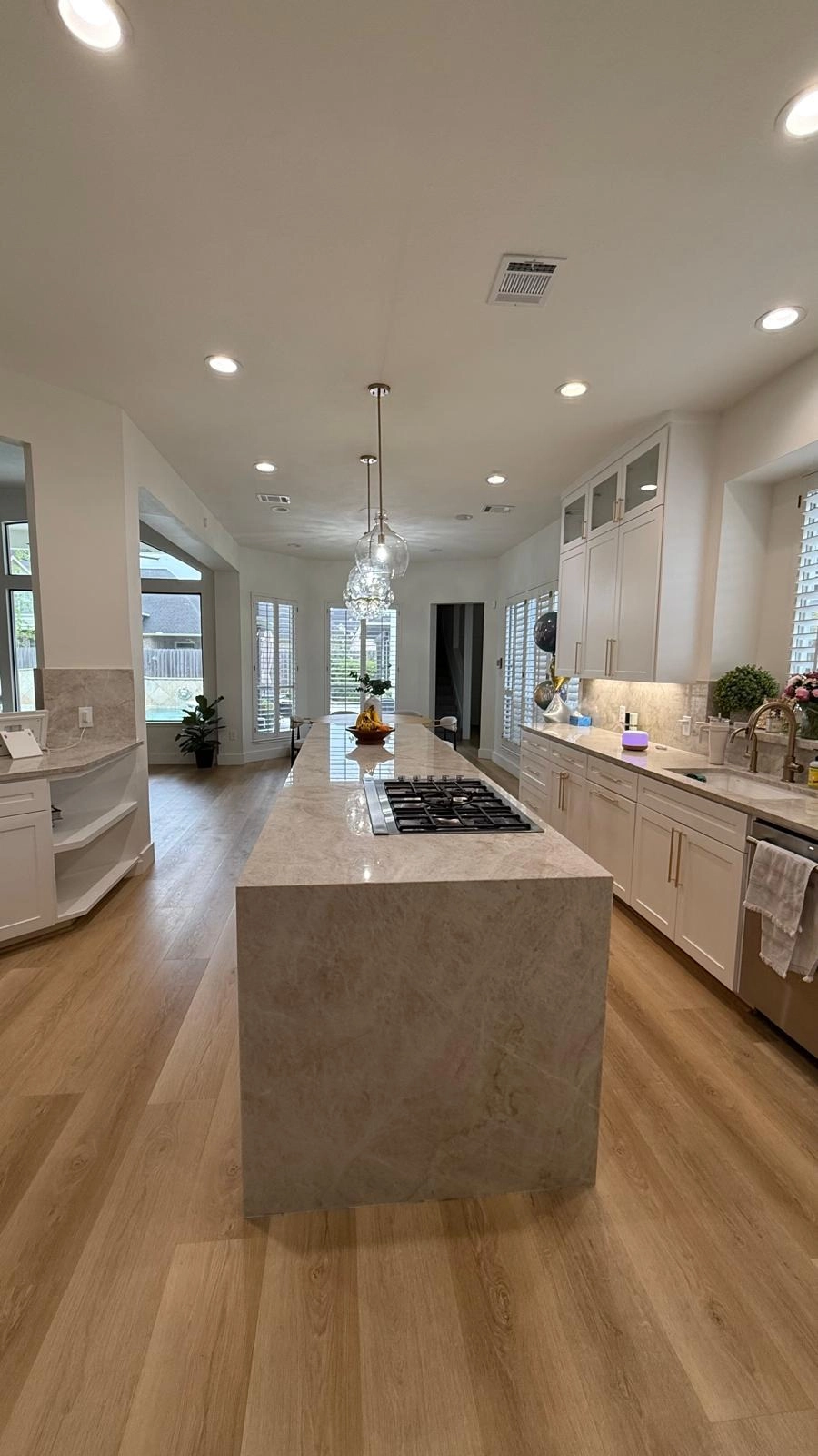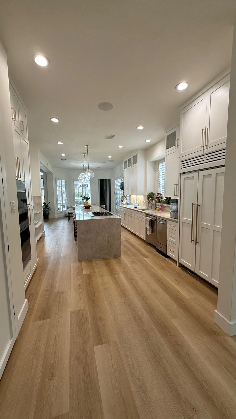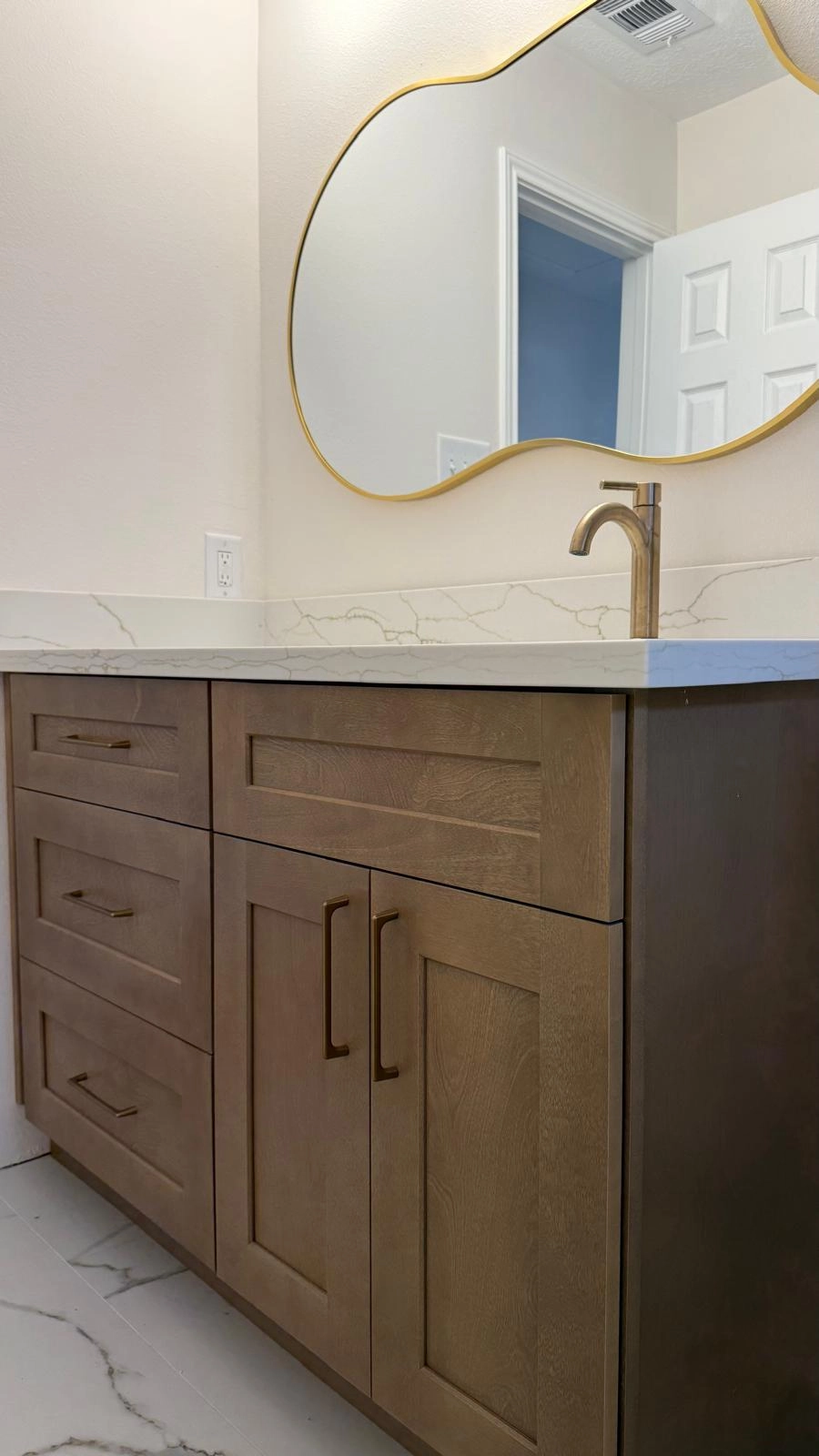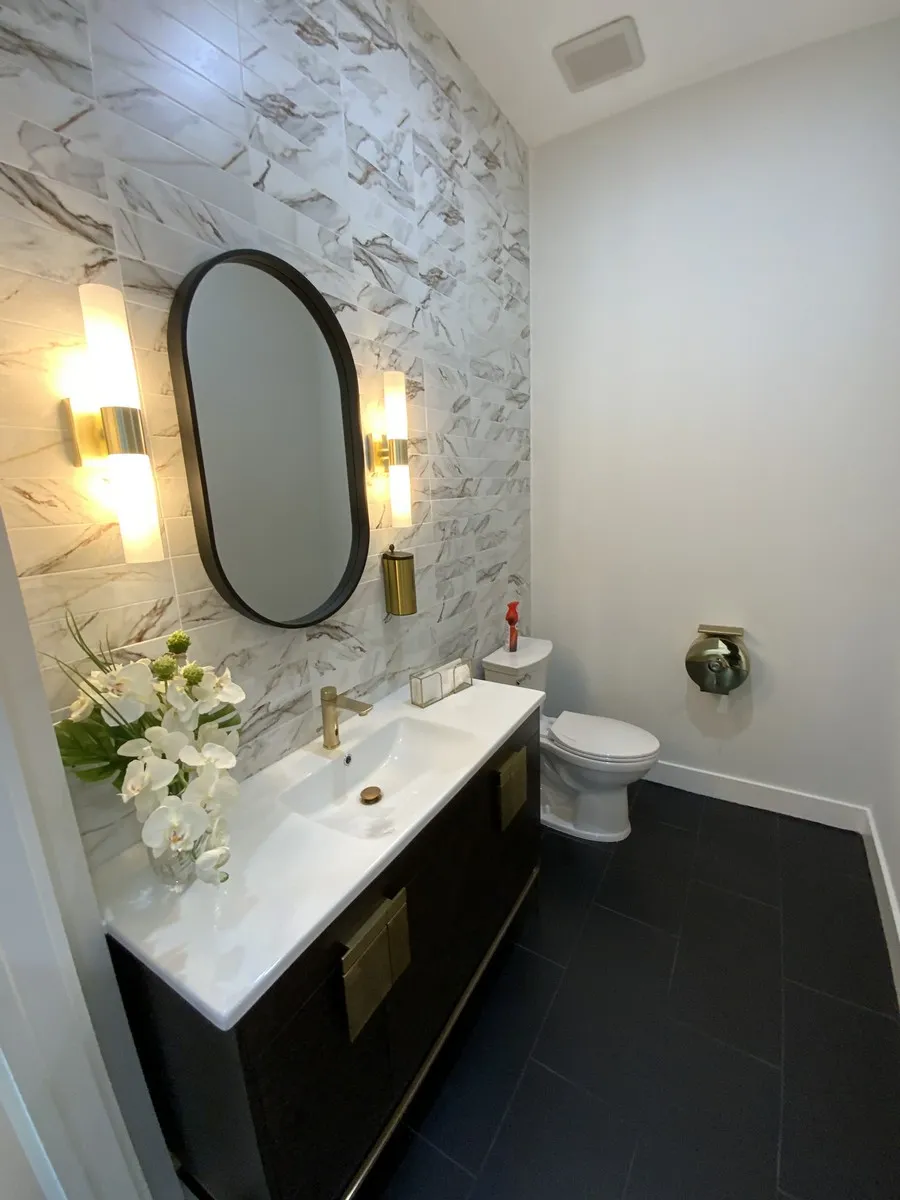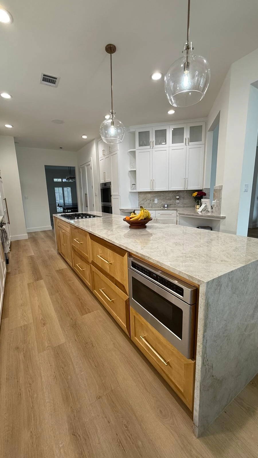 In our recent kitchen remodel, we transformed the space with a blend of practicality and style. The cabinets received a fresh look with a skillfully applied coat of paint, while pre-fabricated and custom countertops added both functionality and aesthetic appeal. The custom glasswork on cabinets introduced a touch of sophistication, complemented by an exotic backsplash that became a focal point of elegance. The addition of a kitchen hood not only enhanced ventilation but also contributed to a sleek and modern atmosphere. To add a hint of glamour, we painted the walls with a subtle glitter finish, elevating the overall aesthetic of the renovated kitchen.